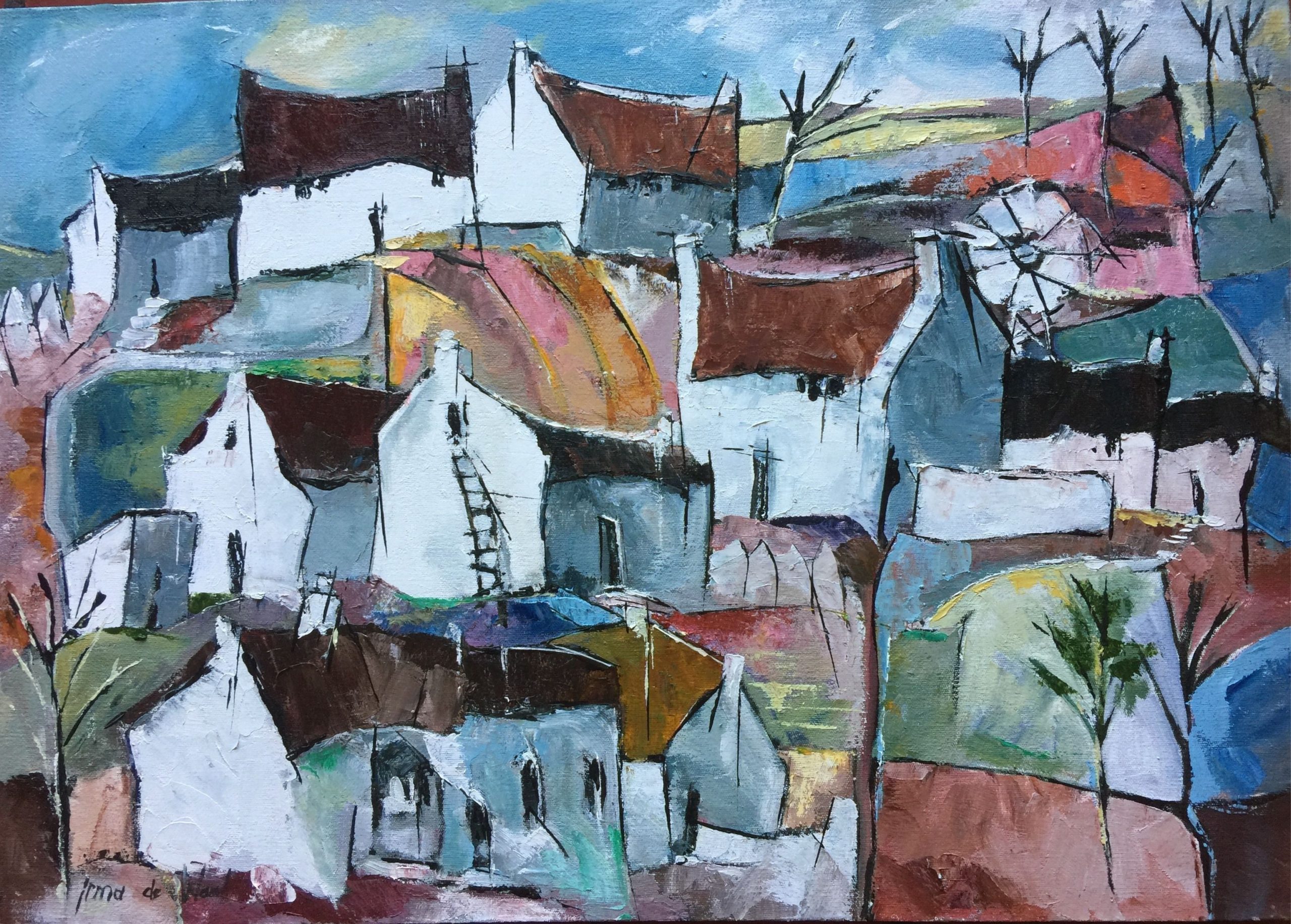Modern and colourful, this painting depicts a winter countryside scene where a couple of houses are built together on the hillside. The white -washed cottages are nestled between the browns, blues and pinks of the unworked soil lands. In the right hand corner some leafless trees are reaching towards the sky like outstretched fingers.Courier fee: Please note that the courier fee is not included in the price or at checkout, arrangement will be made with the buyer after painting has been sold.